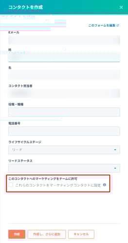 コンタクトオブジェクトの「新規作成」から作成フォームを開き、「これらのコンタクトをマーケティングコンタクトに設定」にチェックを入れる。
