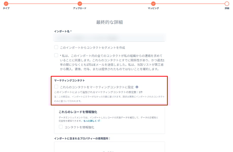 インポートの最終確認ステップで「これらのコンタクトをマーケティングコンタクトに設定」にチェックを入れる。