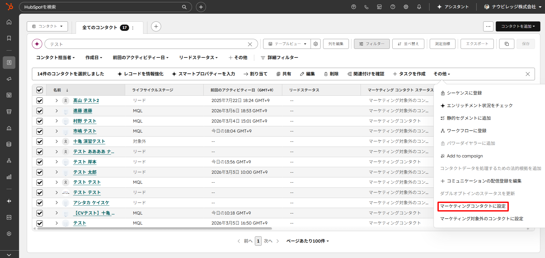 コンタクトビューやリストでコンタクトを選択し、「マーケティングコンタクトに設定」ボタンから設定。