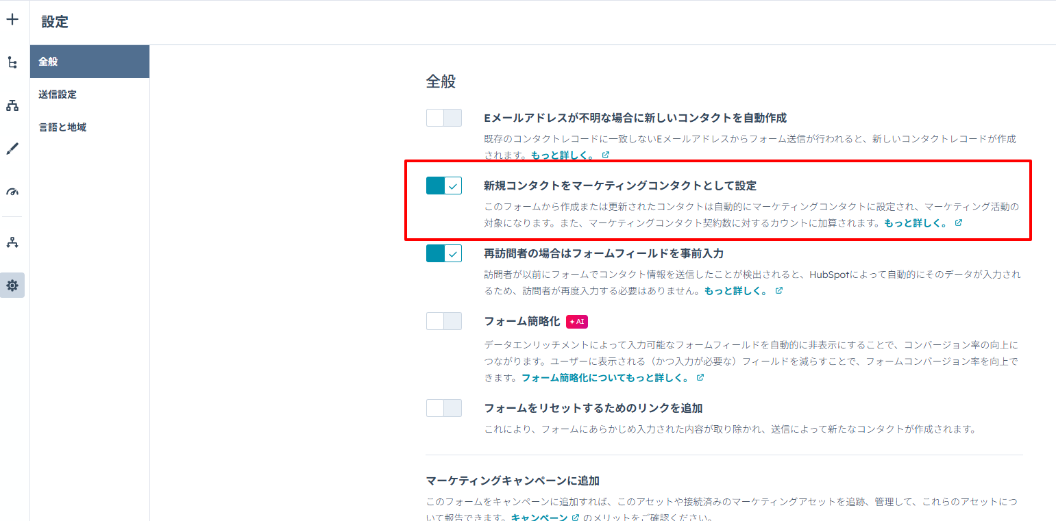 該当のフォーム編集画面で「新規コンタクトをマーケティングコンタクトに設定」の設定をオンにすると、フォーム送信したコンタクトが自動的にマーケティングコンタクトに追加される。