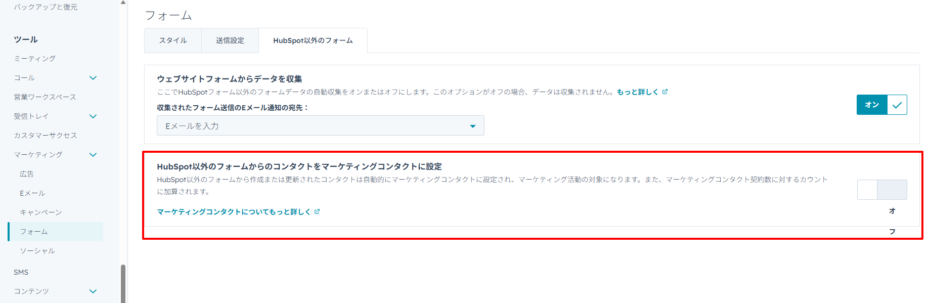 設定画面内を「マーケティング」 > 「フォーム」 > 「HubSpot以外のフォーム」と進み、「HubSpot以外のフォームからのコンタクトをマーケティングコンタクトに設定」の設定をオンにすると、トラッキングコード埋め込み済みのページ内のフォームを送信したコンタクトが自動的にマーケティングコンタクトに設定される。