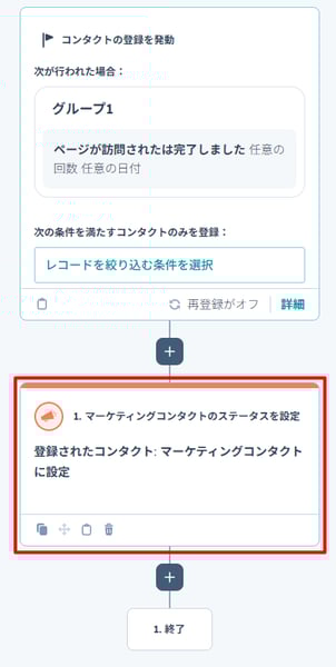 「マーケティングコンタクトのステータスを設定」アクションを使用して、特定の条件(例:特定の資料請求があった、特定のページを見た)を満たした瞬間に自動的に追加する。